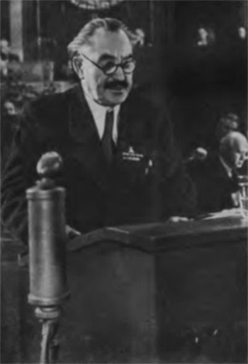 Проводил решения Сталина:Димитров Георгий Михайлович (18.6.1882, село Ковачевцы Перникского округа Болгарии - 2.7.1949, Барвиха близ Москвы), партийный деятель. Сын ремесленника. С 1894 работал наборщиком. С 1901 секретарь профсоюза печатников (София). В 1902 вступил в Болгарскую рабочую социал-демократическую партию (БРСД), а в 1903 вошел в большевистскую ее часть "тесных социалистов". С 1909 член ЦК БРСД (тесных социалистов), которая в 1919 была преобразована в Болгарскую коммунистическую партию (БКП). В 1909-23 секретарь Общего рабочего профсоюза, организатор забастовок. В 1913-23 депутат Болгарского парламента. В сент. 1923 один из руководителей коммунистического вооруженного восстания в Болгарии. После провала попытки захвата власти заочно приговорен к смертной казни и уехал за границу. Активно участвовал в работе Коминтерна, вел коммунистическую пропаганду. В 1933 арестован в Берлине и обвинен в причастности к поджогу Рейхстага, однако на Лейпцигском процессе (сентябрь-декабрь 1933) оправдан. Его выступления были широко использованы большевистской пропагандой, а самому Димитрову было предоставлено советское гражданство, и СССР потребовал его выдачи. 27.2.1934 прибыл в СССР. В 1935 избран генеральным секретарем Исполкома Коминтерна (ИККИ). Главный проводник сталинской политики на международной арене, создатель "пятых колонн" в странах Европы. Имя Димитрова. получившего благодаря Лейпцигскому процессу международную известность, использовалось для создания иллюзии независимости Коминтерна от решений И.В. Сталина. В 1937-45 депутат Верховного Совета СССР. 22.6.1941 поставлен во главе "руководящей тройки" ИККИ, возглавив всю текущую его деятельность. В 1942 поставлен во главе созданного под контролем Москвы Отечественного фронта Болгарии. 15.5.1943, когда Сталин решил установить более жесткий контроль за "братскими" компартиями, Димитров распустил Коминтерн и в июне 1943 был назначен зав. отделом международной информации ЦК ВКП(б). После того как советские войска установили в Болгарии "народно-демократический режим", Димитров в ноябре 1945 прибыл на родину и в ноябре 1946 стал пред. Совета министров. Влек. 1947 стал генеральным секретарем ЦК БКП. Под его руководством Болгария попала под полный контроль Москвы, практически потеряв независимость, и стала превращаться, как позже говорили, в "шестнадцатую республику СССР". После смерти по "образу и подобию" В.И. Ленина тело Димитрова было забальзамировано и помешено в специально построенный мавзолей. После падения коммунистического режима в Болгарии его прах был перезахоронен, а мавзолей демонтирован. Использованы материалы из кн.: Залесский К.А. Империя Сталина. Биографический энциклопедический словарь. Москва, Вече, 2000.