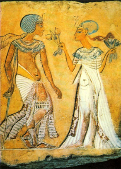 Аменофис IV с женой в саду. Фрейд видел в нём наставника МоисеяЭхнатон (1419–1400 до н.э.), десятый фараон XVIII династии, сын Аменхотепа III и царицы Тии. Эхнатон знаменит тем, что за свою недолгую жизнь осуществил религиозную реформу, подойдя к утверждению единобожия. З.Фрейд, опиравшийся на традиционную хронологическую схему, согласно которой Эхнатон царствовал около 1340 до н.э., видел в нем предтечу и даже наставника Моисея. Однако другие ученые настаивают на пересмотре этой даты и относят правление Эхнатона ко времени около 830 до н.э. (более чем через 500 лет после Моисея), считая его современником таких царей, как Ахав в Израиле, Иосафат в Иудее и Салманасар III в Ассирии. В детстве Эхнатон болел, а возможно, его жизнь была в опасности из-за решения Фиванского оракула, которым ведали жрецы бога Амона. Позже, уже будучи фараоном, он возвысил старого слугу по имени Пареннефер, оказавшего ему в детстве какую-то неоценимую услугу, а к своему собственному имени часто добавлял прозвище, означавшее «Выживший, чтобы жить долго». Вся юность Эхнатона прошла вдали от Фив, а частично и за пределами Египта. О его существовании не упоминается ни в одной из надписей времен правления Аменхотепа III. Царствование Аменхотепа III было периодом наивысшего расцвета и могущества Египта (по крайней мере, со времен строительства пирамид). Аменхотеп являлся верховным владыкой Палестины, Финикии и Сирии, а его собственное государство включало большую часть территории современных Судана и Ливии. Египет имел тесные торговые связи с Микенской Грецией и поддерживал дипломатические отношения, закрепленные брачными узами, с протомидийским царством Митанни, находившимся близ горы Арарат. Единственным серьезным соперником Аменхотепа являлась Ассирийская держава, территория которой простиралась от халдейских городов Южной Месопотамии до областей хеттов (хатти) в Центральной Анатолии, а влияние распространялось еще далее на запад. Аменхотеп III был любителем роскоши и, по крайней мере на склоне лет, человеком распущенным. Реальная власть принадлежала царице Тии, титулы которой свидетельствуют о ее могуществе. После смерти Аменхотепа III она управляла государством в качестве регента. Тия призвала своего сына в Фивы, где он был возведен на трон под именем Аменхотепа IV. Новый фараон вступил в острый конфликт с жрецами Амона, провозгласил себя почитателем лучезарного бога Атона (обычно олицетворяемого солнечным диском – атеном), культ которого был распространен уже во времена Аменхотепа III и Тии. Возведение фараоном храма Атона в Фивах привело к полному разрыву с культом Амона и его жрецами. Аменхотеп сменил свое тронное имя («Амон доволен») на Эхнатон («слуга Атону»). Более того, он уничтожил имя «Аменхотеп» на памятниках своего отца (что для египтянина было актом отнюдь не символического убийства) и разрушил связанные с ним скульптуры сфинксов, сбросив их с обрыва в окрестностях Фив. К пятому году своего правления при поддержке жрецов из Гелиополя – древнего соперника Фив – он перенес царскую резиденцию в новую столицу, за планировкой, стрительством и украшением которой следил самолично, получившую название Ахетатон («Место власти Атона»). Эхнатон сам выступал в качестве верховного жреца Атона, слагал многочисленные гимны в честь этого божества и прововедовал свое уче
