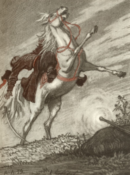 Иллюстрация к рассказу "Страшная месть" Романтические мотивы в творчестве Гоголя приобретают философско-антропологическую окраску, превращаются в своеобразную концепцию человека, в глубине души которого живут «действенные первичные силы», могущие превратить человека в огонь и пламя, силы, способные вызывать «восторг и ужас» одновременно. Причины угасания личности в «ничтожном и временном» Гоголь видит в рационализме XIX века, лишившем человека былой цельности, в раздробленности его внутреннего мира, в «утрате единой идеи», в ценностном хаосе обыденности. Стремление к «низкой роскоши XIX века» иллюстрирует бессодержательность душевных помыслов и утрату человечеством «величия и гениальности». В статьях «Об архитектуре нашего времени», «О Пушкине», «Рим», в небольшом этюде «Скульптура, живопись, музыка» Гоголь набрасывает философско-эстетическую схему исторического развития и приходит к выводам, близким концепции А. Шопенгауэра. Выразительницей «юного и дряхлого века» — нового времени — является музыка. Она свидетельствует о катастрофе человеческого бытия: «человек здесь не наслаждается, не сострадает, он сам превращается в страдание», которое выбрасывает его из мира общепринятого в мир одинокого, неприкаянного «невидимого Я». Цикл повестей «Миргород» — своеобразная модель деградирующего в своем движении мира: от «старосветских» Афанасия Ивановича и Пульхерии Ивановны, живущих в мифологическом времени «простоты их добрых и бесхитростных душ», в гармонии с природой, — к пустоте и абсурду бессодержательной вражды Ивана Ивановича с Иваном Никифоровичем. Человек в итоге настолько духовно нищает, что вещь становится источником безграничной радости и горя, символом трагической судьбы («Шинель»). Скорбное чувство у Гоголя вызывает итог жизни человека. Главный его противник — не людская злоба, но «пошлость жизни... пошлость пошлого человека» («Выбранные места из переписки с друзьями»). В контексте его творчества «пошлость» — фундаментальная философско-религиозная категория, выражающая оскудение человеческой души. «Пошлость» — отказ от подвига быть человеком, ведущий к собственному ничтожеству и внутренней пустоте. Одновременно в этой категории воплощена претензия на признание значительности своего присутствия в мире как события, самим фактом своего существования требующего всеобщего внимания и удивления. Во втором томе «Мертвых душ» Гоголь пишет: «Не то жаль, что виноваты вы стали перед другими, а то жаль, что перед собою стали виноваты — перед богатыми силами и дарами, которые достались в удел вам. Назначенье ваше — быть великим человеком, а вы себя запропастили и погубили». В современном писателю мире былой эстетический идеализм, влекущий к «надмирности» душевных стремлений, уступает место прозе жизни, в которой место былых властителей дум — романтиков Шиллера и Гофмана — занимают их антиподы. Один — «известный Шиллер, жестяных дел мастер в Мещанской улице. Возле Шиллера стоял Гофман, — не писатель Гофман, но довольно хороший сапожник с Офицерской улицы, большой приятель Шиллера» («Невский проспект»).