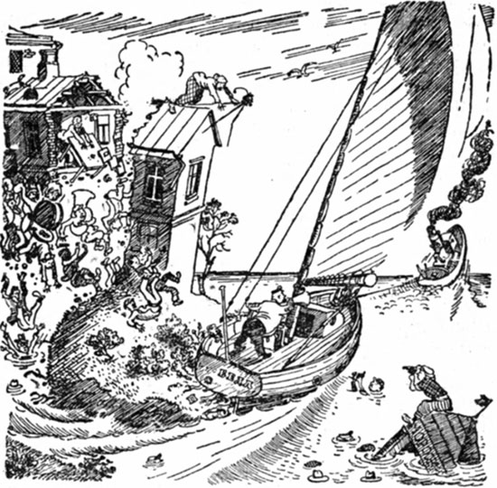 Иллюстрация К. Ротова к повести А. Некрасова Популярность пришла к Некрасову с выходом повести «Приключения капитана Врунгеля». Во время совместной с Б.С.Житковым работы над книгой о С.М.Кирове Некрасов рассказал ему о своем давнем знакомом А.М.Вронском, возглавившем первый китобойный трест на Дальнем Востоке. Этот удивительный рассказчик развлекал на досуге своих друзей выдуманными историями о морских приключениях. Житков подсказал Некрасову мысль написать небольшую повестушку о капитане, который рассказывает о своем кругосветном плавании и «к былям небылиц без счету прибавляет» (История с Врунгелем // Детская литература. 1968. №8. С.22). В дневниках отмечена точная дата рождения идеи повести: «Случилось это в Москве, на Таганке, 22 декабря 1934 года, в 4 часа утра» (Капитан Врунгель, кто он? // Приключения капитана Врунгеля. М., 1991. С.183). Имя литературного героя — Врунгель Христофор Бонифатьевич — родилось не сразу. Некрасов точно знал, что в основе фамилии должен лежать глагол «врать» или один из его синонимов. «После недолгих поисков возникла простая ассоциация: барон Мюнхгаузен (литературное родство которого с героем будущей повести с самого начала было для меня бесспорным), барон Врангель (знаменитый русский моряк, именем которого назван большой остров в Восточной Арктике) и, как производная из этих двух имен, капитан Врунгель» (Рождение и жизнь капитана Врунгеля // Книги — детям. 1967. С.67). В то же время писатель Н.В.Богданов убежден, что одним из прототипов капитана Врунгеля можно считать и самого Некрасова, который слыл в редакционной среде «морским волком» и неизменно веселил сотрудников рассказами-байками (Богданов Н. С кого списан Врунгель // Детская литература. 1989. №12. С.45). В 1937 появился журнальный вариант книги, который был втрое короче первоначального и печатался в виде рисунков-комиксов и кратких подписей к ним, по 6 блоков в каждом номере (Пионер. №1-9, 11-12). Несомненной удачей стало то, что рисунки к повести сделал известный художник К.П.Ротов. Будучи удивительным мастером детали, он, по словам Некрасова, и его «заставил внимательнее приглядываться к подробностям ситуаций, в которых оказались герои» (История с Врунгелем. С.23). В 1939 вышло отдельным изданием книги. В нем были сняты редакторские правки, искажения текста, присущие журнальному варианту. Неоднозначно оценила книгу Некрасова критика 1930-х. В журнале «Детская литература» (1939. №7) были помещены две противоположные рецензии. Л.Кассиль отозвался о повести одобрительно, верил, что ей суждено долгая жизнь, считая ее книгой «для тех, кто любит шутку и ценит затейливую прелесть небылиц, кто примечает истинный жизненный смысл в смешных несуразицах» (С.20). И.Рахтанов предрекал повести Некрасова скорое забвение, назвав ее в ряду «скороспелок, печального, но трудно-искоренимого в жизненной практике явления» (С.22). Через 30 лет этот же критик иначе отозвался о «Врунгеле», включив повесть в разряд «немеркнущих книг, таких, которым суждено долгая и счастливая жизнь» (Рахтанов И. О человеке бывалом, писателе веселом // Пионер. 1967. №9. С.58). Большая часть произведения — монолог главного героя о своих морских путешествиях. Действие повести развивается динамично, согласно специфике жанра приключенческого произведения. В основе сюжета новеллы-анекдоты, в которых переплетается предельно реа