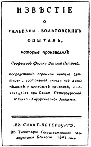 Выпуская в свет свой труд «Известие о гальвани-вольтовских опытах», В. В. Петров писал: «Поелику же, сколь мне известно, доселе никто ещё на российском языке не издал в свет и краткого сочинения о явлениях, происходящих от Гальвани-Вольтовской жидкости, то я долгом моим поставил описать по-российски и расположить в надлежащем порядке деланные самим мною важней-шие и любопытнейшие опыты посредством Гальвани-Вольтовской баттереи,...а в V и VIII статьях все без изъятия опыты суть такие, о которых прежде производства оных не случалось мне читать нигде известия». В 1802 г. В. В. Петров открыл явление свечения, возникающего между угольными электродами, по которым проходит электрический ток. Оно описано в «Известиях о гальвани-вольтовских опытах» и впоследствии было названо вольтовой дугой. Открытие вольтовой дуги было ошибочно приписано знаменитому английскому учёному Гемфри Дэви. Но Дэви, докладывавший несколькими годами позже Королевскому обществу о такого рода явлении, не претендовал на приоритет в его открытии. Явление вольтовой дуги Дэви описал лишь в 1810 и 1812 гг. Получив вольтову дугу, В. В. Петров обстоятельно исследовал её свойства и обнаружил возможность применения дуги для освещения, а высокую температуру, развивающуюся в дуге, — для расплавления и сварки металлов. Эти важнейшие применения, отмеченные В. В. Петровым, составляют весьма важные приложения дуги к практическим нуждам настоящего времени. Она теперь применяется в дуговых источ-никах света, в плавильных печах, в электрометаллургии и в электро-сварке. [87] В. В. Петров впервые произвёл много опытов электролиза (разложения посредством электрического тока) жидкостей — воды, алкого- [ИЛЛЮСТРАЦИИ] Снимок двух страниц из книги В. В. Петрова, где он сообщает о своих первых наблюдениях над вольтовой дугой, сделанных раньше наблюдений Дэви.