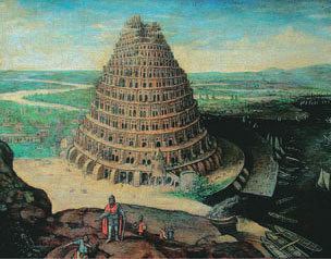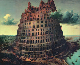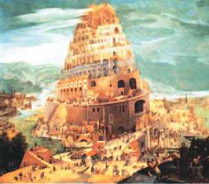 И люди занялись постройкой. Сошёл Господь посмотреть город и башню, которую строили сыны человеческие. И смешал Господь язык людей, так что они не понимали друг друга и не могли продолжать строить башню (поэтому то место стало называться «Вавилон», то есть «смешение»). Но и город Вавилон, и его знаменитая башня были построены. Об этом говорят и сохранившиеся свидетельства современников, и археологические раскопки. Сохранились и изображения башни. Самое раннее — на барельефе в Салернском соборе на юге Италии. Оно сделано в XI веке. Башня изображена как небольшое двухэтажное недостроенное здание. Причем высота первого этажа здесь меньше роста строителей. Один из них передаёт в плошке раствор, а находящийся на втором этаже принимает его. И из-за такого сооружения было вавилонское столпотворение? Художник явно недофантазировал. Надеялся, что это сделают потомки? Прошло ещё сто лет, но представление о башне почти не изменилось. На сицилийской мозаике XII века размеры башни не увеличились, но на ней появилось изображение дверей и строительных лесов. Более подробно башня изображена в иллюстрации к пражской Велиславской библии XIV века. Здесь она тоже пока двухэтажная. А из облаков выглядывает Бог и пытается помешать строительству, выламывая кочергой только что положенный в стену кирпич. Ему помогают ангелы. Они кочергами сталкивают строителей с башни. Наступил XV век — эпоха Возрождения. В это время башню изображают уже более солидной. Вокруг башни уже появилась спиральная лестница. Да и строителей прибавилось — их уже больше двадцати. В такой мощной строительной бригаде уже действительно могло возникнуть столпотворение. Однако подлинный переворот в представлениях о Вавилонской башне совершил в 1563 году фламандский художник Питер Брейгель Старший. Он считал, что башня должна быть очень большой — разве можно иначе передать величие людей, состязавшихся с богами и захотевших с помощью башни добраться до неба?