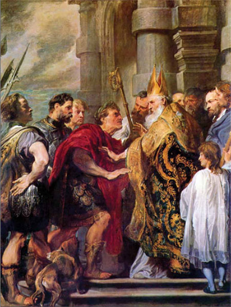 Святой Амвросий и император Феодосий. Амвросий Медиоланский (Ambrosius Mediolanensis) (ок. 339 - 4. IV. 397) - епископ Милана с 374 года; проповедник, богослов (католической церковью признан отцом церкви), церковный политик. Стремился подчинить светскую власть влиянию церкви. Боролся с язычеством и арианством (стоял за Никейский символ веры). Сочинял церковные гимны, считается основателем литургического церковного пения на Западе (амвросианское пение). Советская историческая энциклопедия. — М.: Советская энциклопедия. 1973—1982. Том 1. ААЛТОНЕН – АЯНЫ. 1961. Сочинения: Opera omnia, Mignc "PL", t. 14-17, P., 1866. Литература: Dudden P. H., The life and times of Saint Ambrose, Oxf., 1935.