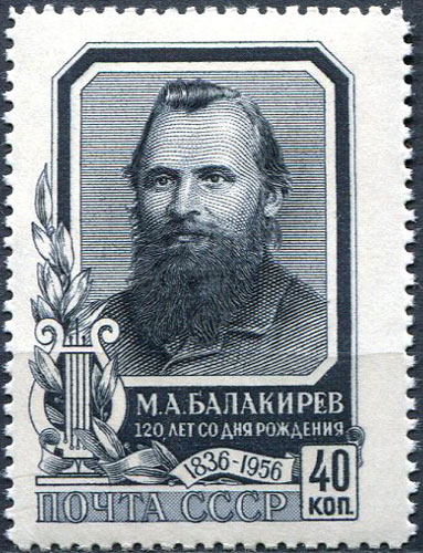 Балакирев Милий Алексеевич (1836—1910) — российский музыкальный и общественный деятель, композитор, дирижер и пианист. Глава творческого объединения русских композиторов «Новая русская музыкальная школа» («Балакиревский кружок» или «Могучая кучка»), возникшего в 1856 г. и оформившегося в начале 1860-х гг. В 1862 г. вместе с дирижером Г. Я. Ломакиным организовал в Петербурге бесплатную музыкальную школу и был ее руководителем (1868—1873, 1881 — 1908). В 1883—94 гг. — главный дирижер Имп. Русского Музыкального общества, управляющий Придворной певческой капеллой. Популяризировал наследие М. И. Глинки в России и за рубежом. Автор музыки к трагедии В. Шекспира «Король Лир», двух симфоний (1897,1908), симфонических поэм «Тамара» (1882), «Русь» (1887), «В Чехии» (1905), камерно-инструментальных сочинений и романсов. Орлов А.С., Георгиева Н.Г., Георгиев В.А. Исторический словарь. 2-е изд. М., 2012, с. 28.