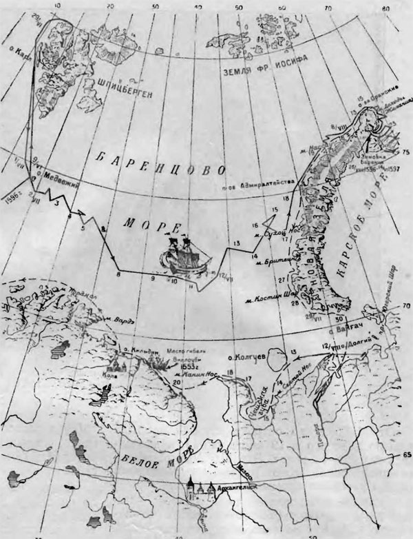 Суда Баренца. Из «Морского дневника» Де-Фера, 1598 год. Баренц (Barents, Barendsz) Виллем (ок. 1550–1597), голландский мореплаватель, исследователь Арктики. В арктических водах совершил три плавания – в 1594, 1595 и 1595–1597 годы. В 1596 году открыл вторично (после русских поморов) острова Медвежий и Западный Шпицберген. После зимовки в Ледовой Гавани на северо-восточном берегу Новой Земли на пути домой в июне 1597 года скончался. Спустя год были опубликованы записки участника этого похода Геррит де Фера, получившие всемирную известность (изданы на русском языке в 1936 году). Баренц первым нанёс на карту практически все западные (1500 км) и севарные (50 км) берега Новой Земли, а также короткие участки её восточного (100 км) и южного (50 км) побережий. Ежедневные записи Баренца о погоде очень долго (в течение нескольких веков) оставались единственными материалами, характеризующими климат северной части Новой Земли. Именем Баренца названы море, один из островов в архипелаге Шпицберген, российский посёлок на Шпицбергене и острова у западного побережья Новой Земли. Современная иллюстрированная энциклопедия. География. Росмэн-Пресс, М., 2006.