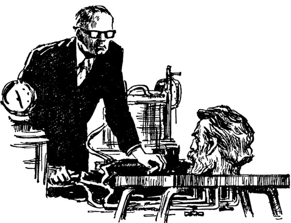 Иллюстрация к роману «Голова профессора Доуэля» Беляев Александр Романович (1884 - 1942), прозаик. Родился 4 марта (16 н.с.) в Смоленске в семье священника. С детства много читал, увлекался приключенческой литературой, особенно Жюлем Верном. Впоследствии летал на аэропланах одной из первых конструкций, сам мастерил планеры. В 1901 окончил духовную семинарию, но священником не стал, напротив, вышел оттуда убежденным атеистом. Любил живопись, музыку, театр, играл в любительских спектаклях, занимался фотографией, изучал и технику. Поступил в юридический лицей в Ярославле и одновременно учился в консерватории по классу скрипки. Чтобы заработать деньги на учебу, играл в цирковом оркестре, рисовал театральные декорации, занимался журналистикой. В 1906, окончив лицей, вернулся в Смоленск, работал присяжным поверенным. Выступал в качестве музыкального критика, театрального рецензента в газете "Смоленский вестник". Он не переставал мечтать о дальних странах и, накопив деньги, в 1913 путешествует по Италии, Франции, Швейцарии. Впечатления от этой поездки он сохранил на всю жизнь. Вернувшись в Смоленск, работал в "Смоленском вестнике", через год стал редактором этого издания. Тяжелая болезнь - костный туберкулез - на 6 лет, три из которых он был в гипсе, приковала его к постели. Не поддаваясь отчаянию, он занимается самообразованием: изучает иностранные языки, медицину, биологию, историю, технику, много читает. Победив болезнь, в 1922 возвращается к полноценной жизни, служит инспектором по делам несовершеннолетних. По совету врачей живет в Ялте, работает воспитателем в детском доме. В 1923 переезжает в Москву, начинает серьезную литературную деятельность. Печатает научно-фантастические рассказы, повести в журналах "Вокруг света", "Знание-сила", "Всемирный следопыт", заслужив титул "советского Жюля Верна". В 1925 публикует повесть "Голова профессора Доуэля", которую сам Беляев называл историей автобиографической: хотел рассказать, "что может испытать голова без тела". В 1920-е вышли такие известные произведения, как "Остров погибших кораблей", "Человек-амфибия", "Над бездной", "Борьба в эфире". Пишет очерки о великих русских ученых - Ломоносове, Менделееве, Павлове, Циолковском. В 1931 переезжает в Ленинград, продолжая много работать. Особенно интересовался проблемами освоения космоса и океанских глубин. В 1934, прочитав роман Беляева "Воздушный корабль", Циолковский написал: "... остроумно написан и достаточно научен для фантазии. Позволю себе изъявить удовольствие т. Беляеву". В 1933 выходит книга "Прыжок в ничто", 1935 - "Вторая Луна". В 1930-е были написаны "Звезда КЭЦ", "Чудесное око", "Под небом Арктики". Последние годы жизни провел под Ленинградом, в г. Пушкине. Войну встретил в больнице. 6 января 1942 Беляев умер от голода в оккупированном Пушкине. Использованы материалы кн.: Русские писатели и поэты. Краткий биографический словарь. Москва, 2000.