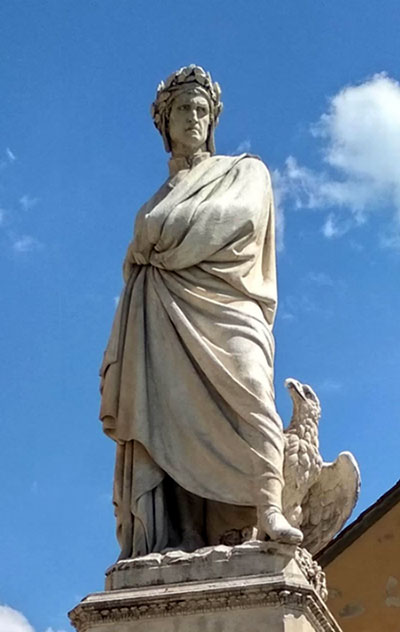 Памятник Данте во Флоренции. На рубеже XIII и XIV столетий в Италии вместо литературного языка средневековья — латинского — стал постепенно завоёвывать своё место в литературе народный язык. На тосканском диалекте писал свои стихи болонский юрист Гвидо Гвиницелли (около 1230—1276) Его знаменитая канцона «Любовь гнездится в сердце благородном» уже совершенно ясно подчёркивала ту мысль, что благородство человека заключается не в его происхождении, а в его личном достоинстве. Стихотворное мастерство Гвидо Гвиницелли получило дальнейшее развитие не в «учёной» Болонье, где был старейший университет в Европе, а во Флоренции, передовом городе развивающейся промышленности. Это направление стало называться «сладостный новый стиль» (dolce stil nuovo). К нему примкнули Гвидо Кавальканти («другой Гвидо», как называет его Данте), Чино да Пистойя и величайший из всех — Данте Алигиери (1265—1321). Значение творчества Данте громадно. В раннем произведении «Новая жизнь» (1292— 1295 гг.), написанном на итальянском языке и представляющем собой цикл стихотворений (сонетов, канцон и баллад) с прозаическим комментарием к ним, Данте рассказал историю своей любви к Беатриче, начиная с первой встречи, когда ему было 9 лет, и до смерти его возлюбленной, когда ей исполнилось 18 лет. Здесь впервые чувство любви рассматривается в его развитии, оно перестаёт быть неподвижной характеристикой «благородного сердца», как у предшественников Данте. В неоконченном произведении «Пир» (около 1308 г.) Данте задумал изложить всю схоластическую учёность своего времени в виде 14 канцон и прозаического комментария к ним. Во введении Данте счёл необходимым оправдать применение итальянского языка — «ячменного хлеба» —для столь «высокой» темы, тогда как обычно считали, что подобает ей латинский язык — «пшеничный хлеб». Со свойственным ему темпераментом он обрушивается на тех, кто «хулит наш милый volgare» (народный язык). К вопросу о народном языке Данте возвращается в специальном трактате «О народной речи», написанном по-латыни, потому что предназначался этот трактат для учёных, а не для широких кругов. Данте указывает на три новых литературных языка, доказавших свою жизнеспособность: старофранцузский, провансальский и итальянский. В этом последнем он различает много диалектов и доказывает, что наибольшими возможностями стать общелитературным итальянским языком обладает тосканский диалект. Грандиозные задачи, стоявшие перед Данте при создании величайшего из его произведений — «Комедии», получившей у потомков название «Божественной», заставили автора прибегнуть к более широкому языковому материалу, чем он сам предусматривал это в своём теоретическом труде — «О народной речи»: для того, чтобы обрисовать мир потусторонний, существовавший согласно традиционным религиозным воззрениям, у Данте не было иных средств, как воспользоваться образами мира земного. Поэтому в своей поэтической практике ему пришлось воспользоваться не только языком поэтов «сладостного нового стилям, но и языком поэтов, более близким к разговорной речи. Вместе с тем в «Божественной комедии» итальянский поэтический язык приобрёл такое богатство, получил такую законченность и такую устойчивость, какой не знал ни один другой западноевропейский язык того времени. Творец «Божественной комедии» по праву счита