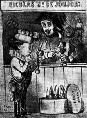 Франц-Иосиф. Хоть я и беру их на достигнутых условиях, но боюсь, что когда они надоедят, вы не захотите их взять обратно, да еще, пожалуй, обрушитесь на меня со всей вашей лавочкой. (Карикатура Шам на русско-австрийские отношения в 1849 года, из французского журнала Charivari).