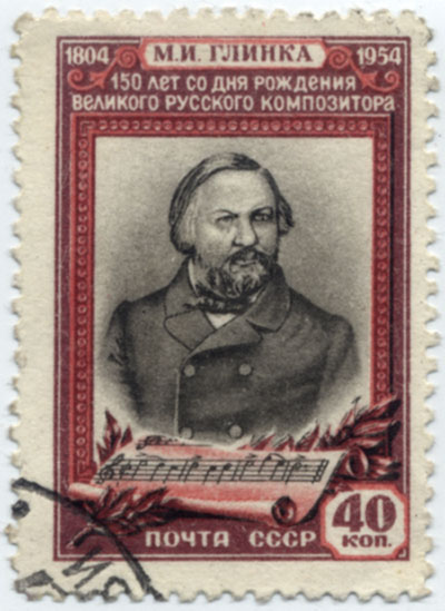 Марка, выпущенная к 150-летию композитора. ГЛИНКА (1804—1857). Родился Михаил Глинка под утро 20 мая. Возле окон спальни, где лежала его мать, в кустах заливались соловьи. Не следует, конечно, придавать большое значение знамениям: песне соловья и восходу солнца. В тот момент, да и во многие последующие годы никто бы и подумать не мог, что родился великий композитор. Ведь гением, в отличие от титулованных особ и наследников огромных состояний, почти ничего не дается даром, без труда. У Михаила Глинки, насколько можно судить по имеющимся сведениям, по линии предков никто не выказывал особых дарований. Бабушка держала его под своей опекой. Она оберегала ребенка от сквозняков, простуды. Его выносили во двор только в сухую и теплую погоду, а комнаты, где он находился, жарко топили от ранней осени до поздней весны. Миша начал ходить только в полтора года. Его младенческие впечатления от внешнего мира были очень ограничены. Возможно, это способствовало его обостренной чувствительности. Он с особой чуткостью прислушивался и присматривался к окружающему. Яркие его переживания были связаны с народными песнями, сказками, потехами. Именно тогда, в детстве, Михаил Глинка неосознанно воспринимал сам склад народных русских напевов, те интонации, которые нельзя воссоздать нарочито, благодаря выучке, а можно только так же естественно, словно разговаривая на родном языке, воплотить в своем творчестве. «Я был весьма набожен, — вспоминал он, — и обряды богослужения, в особенности в дни торжественных праздников, наполняли душу мою живейшим поэтическим восторгом». С необычайной силой в душе его отзывались колокольные перезвоны. Они его завораживали, переносили в какой-то иной, невидимый, возвышенно-звучащий мир. Однажды, услышав в комнате звон медного таза, Миша стал вызванивать на нем нечто подобное колокольному звону. Бабушка велела дать ему два тазика, а затем распорядилась, чтобы приходской священник снял для ее внучка маленькие колокольца со звонницы. Миша Глинка был счастлив. Грамота ему давалась легко. Он рано научился читать, да не бесцветным голосом, а с выражением, звонко, вдохновляясь и волнуясь. Бабушка и ее сверстницы приходили в умиление от его чтения Библии. Надо заметить, что его учитель священник Иван Стабровский был человеком незаурядным: отличался искренностью, смелостью, сильным характером. Во время нашествия французов он организовал оборону церкви. Когда супостаты стали грабить дома, сельчане с подоспевшими партизанами прогнали их прочь. Конечно, вряд ли образ этого человека вдохновил Глинку на создание героической оперы «Иван Сусанин» с ее поистине гениальным финалом — «Славься!». Однако будем помнить, что Отечественная война 1812 года, победа русского оружия, рассказы о сражениях, о доблести русских воинов и мужиков-партизан — все это оказало сильнейшее впечатление на маленького Мишу, а след от подобных переживаний и размышлений сохранился на всю жизнь. Один из дальних родственников подарил ему книгу: «История о странствиях вообще по всем краям земного круга, сочинения господина Прево, сокращенная новейшим расположением господина Ле Гарпа и содержащая в себе достойные примечания, полезнейшие и наилучшим образом доказанные сведения о странах света, до коих достигли европейцы, о нравах жителей этих стран, о вере, обычаях, науках, 
