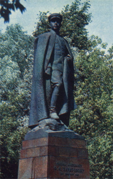 Рыбинск. Памятник генерал-лейтенанту Ф.М. Харитонову. Скульптор М. Манизер. Харитонов Фёдор Михайлович [11(24).1. 1899, с. Васильевское, ныне Рыбинского района Ярославской области,— 28.5.1943, Москва], советский военачальник, ген.-лейтенант (1942). Чл. КПСС с 1918. В Сов. Армии с 1919. Окончил курсы «Выстрел» (1931) и курсы усовершенствования высшего начсостава при Воен. академии Генштаба (1941). Участвовал в Гражд. войне на Вост. и Юж. фронтах, красноармеец. В 1921—30 работал в военкомате, с 1931 ком-р стрелк. полка. В 1937—41 нач-к штаба 17-й стрелк. дивизии 57-го стрелк. корпуса и нач-к отдела штаба Московского воен. округа. Во время Великой Отечеств, войны с июня 1941 зам. нач-ка штаба Юж. фронта, с сентября командующий 9-й армией того же фронта, с июля 1942 — 6-й армией Воронежского, затем Юго-Зап. фронтов. Принимал участие в оборонит, боях в Зап. Украине, Молдавии и Донбассе. Особенно отличились войска 9-й армии под командованием X. в ходе Ростовской оборонит, операции 1941. Опираясь на созданную армией сильную противотанковую оборону, её правофланговые соединения отразили многочисленные атаки танков пр-ка. X. успешно руководил войсками в Ростовской наступат. 1941, Сталинградской битве, Острогожско-Россошанской операции и в боях на харьковском направлении. Награждён орденами Красного Знамени, Кутузова 1-й степени и медалью «XX лет РККА». Использованы материалы Советской военной энциклопедии. Литература:Колосов М. Б. Товарищ генерал. М., 1965. Люди боевой доблести. Ярославль, 1958, с. 70—83.