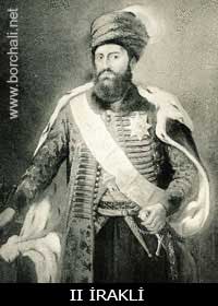 Ираклий II (1744-1798) - царь Кахетии. Первое боевое крещение Ираклий получил в 15 лет. В 1737-1739 годах Надир-шах двинулся походом на Индию. В этом походе участвовал внук Ираклия I. Находясь здесь, он получил хорошую военную выучку. В 1744 году Надир-шах утвердил Теймураза царем Картли, а его сына Ираклия царем Кахетии. Перед своим отъездом в Иран Теимураз передал управление страной вместе с Ираклием II сыну брата Вахтанга VI Иесе Абдуле-бегу, пытаясь этим избежать конфликта между ними, но Абдула-бег предъявил свои претензии на единоличное царствование в Картли. Ираклий одержал победу над Абдула-бегом. В 1749 году Ираклий окончательно изгнал из Тбилиси кызылбашский гарнизон. Влияние и авторитет царей Теймураза и Ираклия все больше возрастали. Ереванское, Ганджинское и Нахичеванское ханства попросили покровительства у грузинских царей и стали их вассалами. В 1751 году 3-тысячное грузинское войско Ираклия разгромило 18-тысячное войско Азат-хана у Кирбулахи (близ Еревана) и Азат-хан попросил мира. В 1752 году Ираклий нанес жестокое пора-жение Аджи-Чалабу, наголову разбив его войско. Влияние Ираклия и Теймураза вновь возросло. Однако набеги дагестанцев все еще представляли серьезную опасность для страны. В 1754 году в битве при Мчадиджвари и в 1755 году в битве у Кварели Ираклий II одержал победу над вторгшимися в Грузию дагестанцами во главе с Нурсал-бегом. В 1758 году Теймураз II, Ираклий II и Соломон I заключили между собой союз, по которому должны были оказывать помощь друг другу в случае нападения врага. Когда в 1759 году дагестанцы вновь вторглись в Кахети, Ираклию помогал в борьбе Соломон I. Ираклию II после смерти Теймураза с 1762 года стал царем объединенного Картли-Кахетского царства. Царь Ираклий II проводил довольно жесткую внутреннюю политику и не терпел самоуправства феодалов. Часть картлийских князей стала готовить против царя заговор. Целью заговора было посадить на престол своего избранника - незаконного сына Вахтанга VI - царевича Паату. Заговор был случайно раскрыт в 1765 году и его участники схвачены и преданы суду. В 1768 году началась Русско-турецкая война. Императрица Екатерина II прислала в Грузию русский отряд под командованием генерала Тотлебена. В 1769 году Ираклий II встретил Тотлебена и проводил его в Имерети. Когда генерал вернулся в Картли, царь предложил ему план похода на Ахалцих. Объединенное войско русских и грузин двинулось к Ахалциху, но у Аспиндзской крепости Тотлебен неожиданно повернул обратно, и вернулся в Картли оставив без поддержки Ираклия II. Ираклий II в Аспиндзском сражении 20 апреля 1770 года наголову разбил объединенное войско турок и дагестанцев, но вынужден был вернуться в Картли из-за предательских действий генерала Тотлебена, который заключил союз с про-тивниками царя и начал с силой занимать города и крепости Картли. В 1774 году было организовано войско. Каждый годный к военной службе мужчина в Картли-Кахетском царстве, невзирая на то, был ли он царевичем, князем, азнауром, ремесленником или кем угодно, обязан был отбывать воинскую повинность за свой счет в течение одного месяца в году. Эта мера дала возможность царю иметь в постоянной боевой готовности 5 тысяч воинов. Войско особенно хорошие результаты принесло в борьбе против дагестанских разбойничьих набегов. В 1776 году Ираклий II заключил мир с Турцией В 1782 году Ираклий II прин