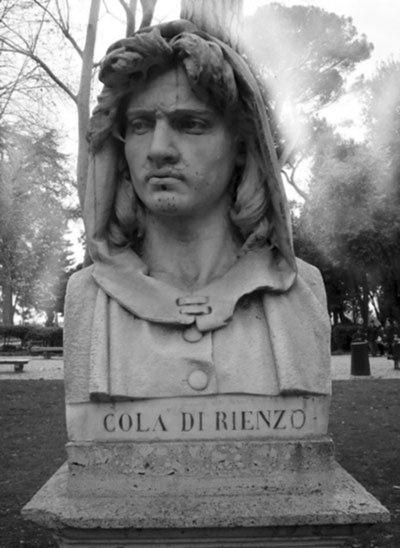 Кола ди Риенцо (Cola di Rienzo) (наст. имя - Никола ди Лоренцо Габрини (Gabrini)) (1313 - 8.Х.1354) - итальянский политический деятель. По образованию нотариус. С 1334 года жил в Риме, где с увлечением изучал античные памятники и литературу. Разделял гуманистические взгляды Петрарки, мечтал о возрождении былого величия Рима. В январе - июле 1343 года находился в составе римского посольства при дворе папы в Авиньоне. По возвращении активно участвовал в политической жизни Рима, обличая в публичных речах бесчинства феодальных магнатов (особенно Колонна) - фактических правителей Рима. Восстание пополанских масс Рима в мае 1347 года привело к установлению республики. Кола ди Риенцо был провозглашен народным трибуном и повел решительную борьбу с феодалами. Опираясь на торгово-ремесленные слои Рима, он вынудил феодалов оставить их замки и укрепленные дома и присягнуть республике. Кола ди Риенцо упорядочил налоги, отменил тяжелые пошлины, стеснявшие торговлю. 1 августа 1347 года он объявил восстановление прав римского народа, провозгласил Рим столицей мира, предложив итальянским государствам направить в Рим посольства. Осенью 1347 года римские феодалы начали открытую борьбу с республикой, и в результате спровоцированного Колонна восстания 15 декабря 1347 года Кола ди Риенцо был вынужден бежать. В июле 1350 года он отправился в Прагу к Карлу IV в поисках поддержки планам возрождения римской республики, но был арестован пражским архиепископом, а 25 февраля 1352 года отлучен папой от церкви. Однако новый папа Иннокентий VI решил использовать Кола ди Риенцо в целях восстановления своих прав в Папской область, направив его туда в конце1353 года с политической миссией. 1 августа 1354 года с помощью кондотьерских отрядов Кола ди Риенцо вступил в Рим, где горожане, резко недовольные правлением феодальных магнатов, приветствовали его как победителя. Но для борьбы с Колонна и другими магнатами Кола ди Риенцо вынужден был увеличить налоги и в ряде случаев провел конфискацию имущества граждан. Все это, а также тирания, методы его правления привели к восстанию 8 октября 1354 года, во время которого он был убит. Л. М. Брагина. Москва. Советская историческая энциклопедия. В 16 томах. — М.: Советская энциклопедия. 1973—1982. Том 7. КАРАКЕЕВ - КОШАКЕР. 1965. Кола ди Риенцо во главе республикиВ 1347 году в Риме происходит новая вспышка борьбы пополанской коммуны с феодальной знатью. Эту борьбу возглавил Кола ди Риенцо *. Он родился в Риме в семье трактирщика и прачки. Мать Риенцо рано умерла, и он был отправлен в Ананьи, где до 20 лет проживал у родственников, обучаясь латыни и риторике. По возвращении в Рим Риенцо стал нотариусом. Он страстно увлекался античными памятниками и мечтал о восстановлении былого величия Рима. С восторгом наблюдал он, как в 1341 году в Риме венчали лавровым венком поэта Петрарку, который призывал к восстановлению величия в Риме. В 1343 году в составе делегации от Рима он был направлен к папе в Авиньон, став по возвращении оттуда нотариусом папской городской камеры. Будучи блестящим оратором, Риенцо выступает перед народом с обличением феодалов, которые грабят Рим и творят беззакония. 20 мая 1347 года, пользуясь отъездом из Рима крупных феодалов-баронов, Кола ди Риенцо с группой вооруженных сторонников при поддержке римских горожан направился к правительственным зданиям на Капитолии, откуд