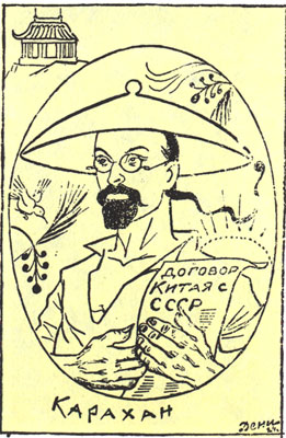 "Друг рикш". Дружеский шарж Дени. 1924 г. Карахан, Лев Михайлович (наст, фамилия Караханян; 1889-1937) — советский государственный деятель; дипломат. Уроженец Тбилиси. Из семьи присяжного поверенного. С 1904 г. член РСДРП(м), с 1913 г. большевик. С марта 1918 по 1920 г. заместитель наркома по иностранным делам. В 1921 г. полпред РСФСР в Польше. С сентября 1923 по август 1926 г. полпред в Китае. В 1927-1934 гг. заместитель наркома иностранных дел, затем (до 3 мая 1937 г.) посол СССР в Турции. Отозван в Москву и арестован. 20 сентября 1937 г. Военной коллегией Верховного суда СССР приговорен к ВМН, расстрелян в тот же день. Тело кремировано в Донском монастыре. В 1956 г. посмертно реабилитирован. Вермахт на советско-германском фронте. Следственные и судебные материалы из архивных уголовных дел немецких военнопленных 1944-1952. (Сост. В.С. Христофоров, В.Г. Макаров). М., 2011. (Именной комментарий). С. 744.