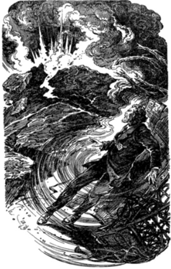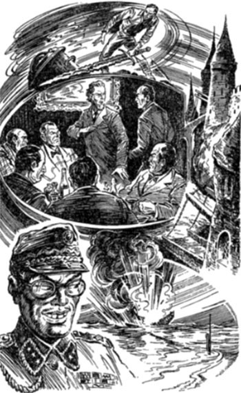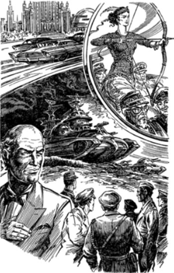Иллюстрация к роману Александра Казанцева. Казанцев Александр Петрович (р. 1906), писатель. Родился 20 августа (2 сентября н.с.) в Акмолинске. Учился в реальном училище в Петропавловске, затем в техническом училище в Омске, в Томском технологическом институте на механическом факультете. В студенческие годы увлекался изобретательством. В 1930 из-за недостатка специалистов в годы первой пятилетки сразу после окончания института назначен главным механиком Белорецкого металлургического комбината. В 1931, находясь в командировке в Москве, продемонстрировал модель изобретенного им электрического орудия С.Орджоникидзе и М.Тухачевскому, которые увидели перспективу межконтинентальной стрельбы. Был переведен с Урала на подмосковный завод, где специально для него была создана лаборатория, переданная в 1933 Электротехническому институту в Москве. Продолжая руководить разработкой электроорудий, стал начальником производства опытного завода ВЭИ. В эти же годы по предложению директора Дома ученых принял участие в конкурсе на лучший сценарий научно-фантастического фильма. Подготовленный совместно с директором сценарий "Аренида" получает высшую премию. Фильм не был снят, но сценарий был опубликован. На его основе Казанцев пишет свой первый роман "Пылающий остров", который в течение двух лет (1939 - 40) печатается в "Пионерской правде". С первых дней войны находится в армии, делает важное оборонное изобретение, за что ему было присвоено звание воен-инженера III ранга с назначением командиром спецчасти и главным инженером завода, вскоре превращенного в научно-исследовательский институт. Испытывал новую технику в боевых условиях на Крымском фронте весной 1942. В 1944 получает звание полковника и новое назначение, вместе с армией входит в Будапешт и Вену. Описание взрыва атомной бомбы в Хиросиме и Нагасаки (6 авг. 1945) напоминает ему подробности катастрофы в Тунгусской тайге в 1908, и он пишет рассказ "Взрыв", вызвавший яростные дискуссии. Организует экспедицию к месту взрыва и участвует в ней. При содействии А.Фадеева получает возможность совершить два рейса на ледоколе "Георгий Седов" и посетить множество полярных станций. Пишет серию полярных новелл: "Против ветра" (1950), "Гость из космоса" (1958). В разные годы появляются его знаменитые произведения: "Планета бурь" (1959), "Лунная дорога" (1960), "Ступени грядущего" (1962). Встречи с современными учеными (в том числе с Лео Сцилардом, Нильсом Бором и др.) питали научное воображение Казанцева. В 1972 - 74 пишет трилогию "Фаэты". Роман "Купол Надежды" является художественным отражением научных идей академика Несмеянова. Интересы А.Казанцева были необыкновенно разносторонними: получив в юности музыкальное образование, он был автором фортепьянного концерта, баллады "Рыбачка". С 1953 является мастером спорта по шахматам, был судьей всесоюзной категории по шахматным композициям и международным арбитром. В течение 30 лет и по настоящее время состоит членом редколлегии журнала "Изобретатель и рационализатор". Использованы материалы кн.: Русские писатели и поэты. Краткий биографический словарь. Москва, 2000.