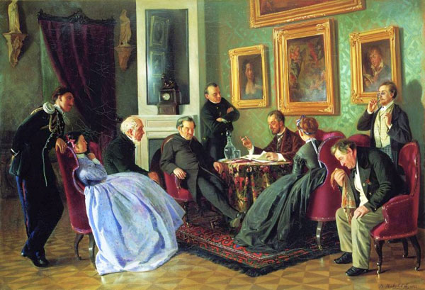 В.Е. Маковский. Литературное чтение. 1866 г. МАКОВСКИЙ Владимир Егорович (1846—1920) — российский деятель культуры, живописец, график и портретист, академик (1873), действительный член Петербургской ЛЯ (1893). Преподавал в Московском училище живописи, ваяния и зодчества (1882— 1894) и в Петербургской АХ (1894-1918), ректор с 1895 г. С 1872 г. член Товарищества передвижных художественных выставок. Главная тема его творчества — городской быт, жизнь различных слоев русского общества, которую он изображал с чувством юмора и в традициях критического реализма («Игра в бабки», 1870; «В приемной у доктора», 1870; «Посещение бедных», 1874; «Осужденный», 1879; «На бульваре», 1886-1887 и Др.). Создал образы русской революционной интеллигенции («Вечеринка», 1875—1897; «Допрос революционерки», 1904), неоднократно откликался на важные события политической жизни России («9 января 1905 года на Васильевском острове», 1905). Орлов А.С., Георгиева Н.Г., Георгиев В.А. Исторический словарь. 2-е изд. М., 2012, с. 293. Маковский Владимир Егорович (26.01.1846-21.02.1920), художник-передвижник. Учился в Московском училище живописи, ваяния и зодчества (1861-66), в 1882-94 преподаватель в этом Училище, в 1894-1918 преподавал в Петербургской Академии художеств (в 1894 — 96 ее ректор). В 1872 вступил в Товарищество передвижных выставок. Первые его произведения — “Игра в бабки” и “В приемной у доктора” (1870) отражали жанровые сценки из народного быта. С сер. 1870-х главная тема творчества Маковского — городской быт, заботы и радости городских низов (напр., “Посещение бедных”, 1874; “Объяснение”, 1881; “Ожидание”, 1875; “Осужденный”, 1879; “На бульваре”, 1887), 1880-90-е — период творческой зрелости Маковского, он посвящает свои произведения социально-политическим проблемам: “Крах банка” (1881), “Вечеринка” (1897) (о студенческой сходке). Маковский работал также как портретист и график. В. А. Федоров