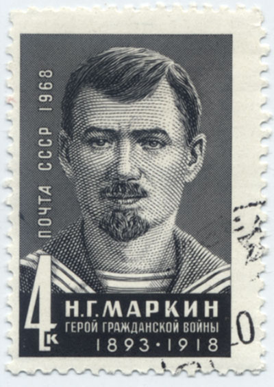 Н.Г.Маркин. Снимок до 1917 г. Маркин Николай Григорьевич [9(21).5. 1893, пос. Сыромяс, ныне Маркине Сосновоборского р-на Пензенской обл.,— 1.10.1918, ок. пос. Пьяный Бор, ныне Красный Бор Мензелинского р-на Тат. АССР], активный участник Гражд. войны. Член КПСС с 1916. В 1914 призван на флот. Служил в учебном минном отряде в Кронштадте. Участник 1-й мировой войны, унтер-офицер. После Февр. революции 1917 член Петроградского Совета от моряков. Делегат 1-го Всероссийского съезда Советов, член ВЦИК. Один из организаторов 1-го съезда моряков Балтики, участник подготовки первого устава Центр, комитета Балт. флота, член Центробалта первого созыва. М. был талантливым агитатором и организатором матросских масс. Участвовал в Окт. вооруж. восстании в Петрограде. Делегат 1-го Всерос. съезда моряков от Балт. флота. В нояб. 1917 назначен секретарём, затем контролёром Наркомата иностр. дел, где вёл борьбу с саботажем чиновников, создавая новый аппарат наркомата. В соответствии с решениями 2-го Всерос. съезда Советов по указанию В. И. Ленина организовал издание «Сборника секретных документов из архивов бывшего министерства иностранных дел». Издано 7 сборников документов, разоблачавших тайные сговоры империалистич. гос-в. С нач. июня 1918 был комиссаром для особых поручений по военно-морским делам. В том же месяце в Нижнем Новгороде (Горький) развернул формирование Волжской воен. флотилии. С августа комиссар и помощник команд, флотилией. Отряды моряков флотилии под его руководством успешно участвовали в подавлении антисов. выступлений в Поволжье, несли охрану заводов, складов, учреждений. В операции но освобождению Казани в сент. 1918 М. возглавил десант моряков. Затем участвовал в боевых действиях флотилии в р-не Пьяного Бора на р. Кама. Погиб в ожесточ. бою 1 окт. 1918 на борту вооруж. парохода «Ваня-коммунист». Именем М. назв. корабли, улицы и площади ряда городов, а село Сыромяс, где он родился, переименовано в Маркине. Использованы материалы Советской военной энциклопедии в 8-ми томах, том 5.