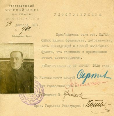 Иллюстрации предоставлены внуком командарма Александром Матиясевичем. Далее читайте:Гражданская война 1918-1920 в России (хронологическая таблица) "Красные" в Гражданской войне (биографический указатель) Белое движение в лицах (биографический указатель) Литература:Тарасов Е. Команштм М. С. Матиясевич. — «Воен.-ист. журн.», 1969, №2.