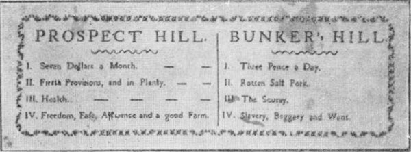 Рис. 8. Американская листовка для английских солдат, сражавшихся у Бенкер-Хилла. Цель — склонить солдат к дезертирству. Листовка представляет ценность и в наше время. В ней не указывается источник, но и не делается попытка скрыть его. В современных условиях подобную листовку можно отнести к серой пропаганде. В этом документе затрагиваются только вопросы материального порядка, а политические проблемы обойдены (Содержание листовки: „Что дает дезертирство: I семь долларов в месяц; II свежие продукты R изобилии; III здоровье; IV свободу, покой, богатство и хорошую ферму. Что дает Бенкер-Хилл: I три пенса в день; II гнилую солонину; III цингу; IV рабство, нужду и нищету").