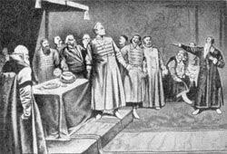 Дьяк Т. Осипов обличает Лжедмитрия I. Осипов Тимофей (ск. 11.05.1606), дьяк. После захвата власти в Москве Лжедмитрием I на него была возложена обязанность торжественно объявить жену самозванца Марину Мнишек царицей, после чего должно было последовать принесение ей присяги. Готовясь к этому дню, Тимофей Осипов наложил на себя пост и двукратно причастился Святых Таин. Затем, когда настало время, он, ничего не сказав жене, предстал перед Лжедмитрием и в присутствии всех громогласно начал свою речь словами: «Велишь себя писать в титулах и грамотах цезарь непобедимый, а то слово по нашему христианскому закону Господу нашему Иисусу Христу грубо и противно: а ты вор и еретик подлинный, расстрига Гришка Отрепьев, а не царевич Димитрий». Мужественный дьяк объявил затем, что не желает присягать иезуитке, царице-язычнице, оскорбляющей своим присутствием московские святыни, и хотел продолжать свою речь дальше, но был тотчас же убит сторонниками самозванца и выброшен из окна. Использованы материалы сайта Большая энциклопедия русского народа - http://www.rusinst.ru Здесь читайте:Последние дни царствования Лжедмитрия I (из дневника Марины Мнишек). Заговор и убийство Лжедмитрия I (из дневника Марины Мнишек). Краткая повесть о злополучии и счастии Димитрия, нынешнего князя московского (документ). Иное сказание (ряд переработанных прежних источников, в том числе “Повесть како отомсти”), 20-е годы XVII века.