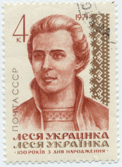 Советская марка, выпущенная в честь 100-летия. Украинка Леся (псевдоним; настоящее имя и фамилия Лариса Петровна Косач) [13(25).2.1871, г. Новоград-Волынский, ныне Житомирской области, — 19.7(1.8).1913, г. Сурами (Грузия), похоронена в Киеве], украинская писательница. Родилась в дворянской семье; дочь писательницы О. Пчилки. Печаталась с 1884. С детства болевшая костным туберкулёзом, У. была вынуждена многие годы жить на юге (в Крыму, Грузии, Италии, Египте). Образование (преимущественно историко-филологическое) получила дома. В юные годы овладела многими иностранными языками. Рано определились и общественные интересы У., вскоре приведшие её к сближению с марксизмом и революционной социал-демократией. В конце 90-х гг. она читала "Капитал" К. Маркса, в 1902 перевела на украинском языке "Манифест Коммунистической партии". Как литературный критик участвовала в изданиях легальных марксистов (журнал "Жизнь" и др.). За связь с российскими марксистскими организациями подвергалась репрессиям, находилась под надзором полиции. В поэзии и драматургии У. продолжала и развивала традиции Т. Г. Шевченко. Книги её стихов "На крыльях песен" (1893), "Думы и мечты" (1899) и "Отзвуки" (1902), проникнутые революционными идеями и призывами к борьбе, не могли появиться в царской России и были изданы во Львове. Творчеству У. присущ последовательный интернационализм. Темы борьбы с классовым и национальным угнетением, мечты о свободном будущем украинского народа естественно переплетаются в её стихах с выражением сочувствия современным итальянским рабочим, древним строителям египетских пирамид и крестьянам средневековой Шотландии (поэма "Роберт Брюс, король шотландский", 1894). В циклах стихов "Невольничьи песни" (1895—1896) и "Песни про волю" (1905) воспевается идея вооружённого восстания, звучат прямые призывы к нему. Поэзия У. отличается богатством исторических и современных мотивов, тонкостью и глубиной чувства, разнообразием строфики, ритмики, поэтических форм и образов. Драмы и драматические поэмы У. написаны преимущественно на исторические и мифологические сюжеты (Древняя Греция, Рим, Египет, Иудея, западноевропейское средневековье). Однако, сохраняя верность историческим чертам и приметам, У. выражает идеи и настроения, актуальные для 20 в. Драматическая поэма "Одержимая" (1901) направлена не только против идеи христианского смирения, но и против толстовского непротивления злу. Драматическая поэма "В катакомбах" (1905) разоблачает идеологию добровольного рабства в ранних христианских общинах Рима; герой этой поэмы — раб, борющийся за свободу, вызывает в воображении не только мифологический образ тираноборца, но и образ Прометея новой эпохи. Столь же многозначительна символика драматических поэм "Вавилонский полон" (1903) и "На руинах" (1904). С идеями Революции 1905—1907 годов перекликаются аллегории "фантастической драмы" "Осенняя сказка" (1905, опубликована 1928), написанной в разгар революционных событий. Образ Иуды в драматическом этюде "На поле крови" (1909) полемически направлен против попыток реакционных писателей и публицистов оправдать философию предательства. В наиболее национальной по форме драме-феерии "Лесная песня" (1912, пост. 1918) собственнической морали противопоставлены любовь и поэзия, творческое горение и простые, здоровые человеческие радости. По мотивам "Лесной песни" написан балет (музык