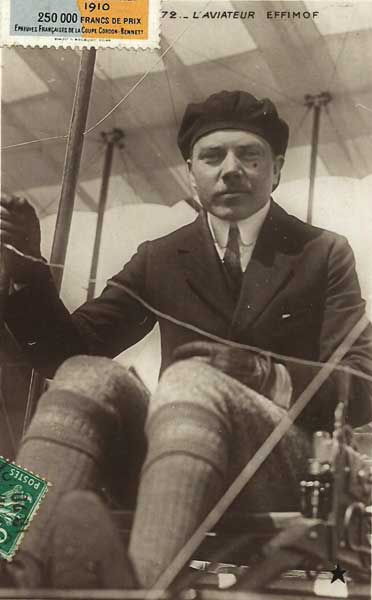 Ефимов на французской открытке. Ефимов Михаил Никифорович [1(13). 11. 1881, с. Аполье, ныне Духовщинского р-на Смоленской обл.,— авг. 1919, Одесса], один из первых русских лётчиков. После окончания Одесского ремесл. уч-ща (1902) работал электротехником и телеграфистом на Юго-Зап. и Забайкальской ж. д. Чемпион России по мотоциклетному спорту (1908—09). Окончив во Франции лётную школу А. Фармана (1910), 8(21) марта 1910 в Одессе первым из рус. лётчиков совершил полёт на аэроплане. На соревнованиях в Мурмелоне, Руане, Реймсе, Ницце (Франция), Вероне (Италия), Петербурге занимал призовые места, установил ряд мировых авиац. рекордов. Работая с 1910 инструктором в Качинской авиашколе (Севастополь), впервые осуществил крутые виражи, пикирование и планирующий полёт с выключ. двигателем. В 1912 изобрёл приспособление, позволявшее пилоту запускать авиац. двигатель без посторонней помощи. Создал оригинальный проект истребителя (1916). Во время Первой мировой войны был лётчиком-истребителем, участвовал в возд. боях. С февраля 1917 служил в Севастополе в воздушной бригаде, был избран членом комитета гидроавиации Черноморского флота. После Октябрьской революции — пилот для особых поручений при комиссаре гидроавиации Черноморского флота, выполнял задания Севастопольского ВРК. Расстрелян деникинцами при взятии ими Одессы в августе 1919 года. Использованы материалы Советской военной энциклопедии в 8-ми томах, том 3.
