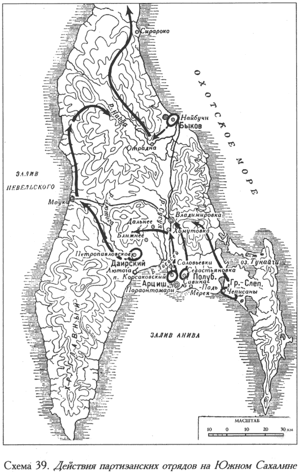 По плану Ляпунова Корсаковский отряд в случае высадки японского десанта на побережье залива Анива должен был, не оказывая упорного сопротивления, немедленно же перейти к партизанским действиям. Все войска Южного Сахалина были разделены на 5 отрядов, и каждому отряду назначен определенный район действий. Отряд Арцишевского 415 человек, 8 орудий и 3 пулемета должен был действовать в районе поста Корсаковского. В этот, отряд вошла береговая батарея, организованная из снятых с затопленного крейсера двух 120-мм и двух 47-мм орудий. Отряд Грото-Слепиковского 190 человек и 1 пулемет в районе села Чеписаны. Отряд Полуботко 160 человек в районе села Севастьяновка. Отряд Даирского 180 человек в районе села Петропавловское. Отряд Быкова 225 человек в районе Найбучи. 5 июля 1905 г. дивизия Харагучи закончила свою погрузку в Хокодате, а в 9 часов 7 июля дивизия начала высадку на побережье Анивского залива между селом Мерея и Савиной падью. Полное господство на море облегчало операцию японцев против Сахалина. Первым втянулся в боевые действия отряд Арцишевского, который занял позицию у села Пораонтомари, для того чтобы дать возможность сжечь здания, склады и пристань в посту Корсаковском. [414] Береговая батарея открыла огонь по японским миноносцам. Вскоре 120-мм орудия оказались испорченными, а для 47-мм орудий снаряды были израсходованы, что заставило русских взорвать все орудия береговой батареи. К 17 часов отряд Арцишевского отошел к Соловьенке, оставив у Корсаковского несколько конных для наблюдения за японцами. На другой день два японских контрминоносца, войдя в бухту Лососей, начали обстреливать Соловьевскую позицию с фланга и тыла, заставив отряд Арцишевского отойти к Хомутовке, а 9 июля, опасаясь быть оторванным, Арцишевский продолжал отступление к селам Дальнему и Ближнему, оставив слабый арьергард, который под натиском японцев отошел, потеряв 2 человек убитыми и 2 ранеными. По донесению оставленной разведки, вечером 9 июля два японских полка выступили из поста Корсаковского в северном направлении. 11 июля отряд окопался на позиции и пытался оказать сопротивление японцам, однако обход обоих флангов вынудил Арцишевского отойти в горы, приведя в негодность орудия и пулеметы из-за отсутствия снарядов и патронов. Оставленная им полурота для прикрытия отхода отчасти рассеялась, отчасти была захвачена в плен, а 16 июля после переговоров с японцами отряд Арцишевского капитулировал в числе 135 человек. Остальные рассеялись. Отряд Слепиковского продержался несколько дольше. Опасаясь потерять сообщения с тылом, Слепиковский 7 июля отошел в тайгу у озера Тунайчи и пробыл здесь до 15 июля, после чего отошел несколько к северу и окопался. 2 августа с утра японцы начали наступление на закрепившийся отряд Слепиковского, который к полудню отступил, потеряв 24 человек убитыми и ранеными. Попытка Слепиковского установить связь с другими отрядами не удалась. Преследуемый японцами отряд Слепиковского был охвачен с флангов и тыла артиллерийским огнем. Командир отряда [416] Слепиковский был убит, а его заместитель, видя отряд окруженным, капитулировал. Отряд Полуботко на другой день после отступления отряда Арцишевского решил пойти к нему на присоединение. На пути отступления к Владмировке больше половины отряда разбежалось, часть отошла в тайгу и в дальнейшем присое