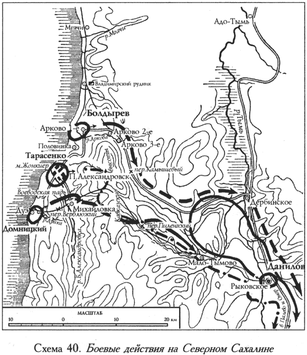 План обороны Северного Сахалина предусматривал отход в глубь острова на Рыковское и Онор и развитие партизанских действий на флангах и в тылу наступающих японцев. Упорное сопротивление предполагалось лишь на участке побережья село Арково 1-е пост Дуэ. Вооруженные силы Северного Сахалина подразделены были на четыре отряда. Арковский отряд Болдырева в составе 4 рот, 2 дружин, 15 сабель и 4 орудий, всего 1320 человек, предназначался для обороны Арковского берегового участка, составлявшего [417] устье Арковской долины. Под натиском превосходных сил этому отряду предписывалось отступать через Камышевый перевал к селу Дербинскому. Оборона Александровского берегового участка от села Половинка до Воеводской пади поручалась Александровскому отряду Тарасенко в составе 8 рот, 4 дружин, 30 сабель, 4 орудий и 6 пулеметов, всего 2413 человек. Дуйский отряд Домницкого силой 4 роты, 2 дружины, 15 сабель и 2 пулемета, всего 1120 человек, должен был оборонять Дуйский участок побережья, а в случае надобности отступать через перевалы Верблюжий и Пиленгский к селу Рыковскому. Дуйский отряд, так же как и Арковский, при отступлении должен был выделить одну дружину в партизанский отряд. Рыковский отряд Данилова 150 человек составлял резерв, оставаясь в селе Быковском. Общие силы Ляпунова достигали на Северном Сахалине около 5000 человек. Покончив с защитниками Южного Сахалина, японцы начали свои действия против Северного Сахалина. Утром 23 июля японский флот показался у западных берегов острова против Александровского поста и обстрелял Арковскую долину и пост Дуэ. После полудня неприятельские суда появились против села Виахта, а позднее было получено сообщение об обстреле неприятельскими миноносцами Де-Кастри. На другой день утром японская эскадра приблизилась к побережью на участке Мгачи Александровский пост и под прикрытием артиллерийского огня начала высадку пехоты севернее Аровской долины. Приказав Арковскому отряду удерживать противника, Ляпунов направил к Камышевому перевалу резерв из Рыковского. Кроме того, не ожидая японцев у Дуэ, Ляпунов приказал Домницкому оставить на месте две дружины, а с остальной частью отряда следовать к Камышевому перевалу. [418] Между тем японцы начали высадку севернее Дуэ, что заставило Ляпунова задержать движение Дуйского отряда и расположить его у Верблюжьего перевала. Активность японцев проявлена была также на участке Александровского отряда. Из-за мыса Жонкиер показались японские контрминоносцы, за которыми следовали транспорты с десантом. Александровский отряд занял Жонкиерские высоты и пытался задержать высадившийся японский батальон, однако движение японцев со стороны Арковской долины в обход правого фланга Александровского отряда заставило Тарасенко отступить к «Кавказским» высотам. Здесь отряд оставался недолго. Опасаясь возможности изолирования отряда, Ляпунов приказал Тарасенко в течение ночи занять Михайловские позиции. В то же время Арковский отряд Болдырева, не оказав противнику сопротивления, отступил к селу Дербинскому, куда прибыл в ночь на 25 июля. Таким образом, русские отряды под давлением японского десанта отступали в глубь острова и в течение 24 июля потеряли убитыми и ранеными 18 человек, а пропавшими без вести 54 человек. 25 июля Александровский отряд, опасаясь обхода правого фланга, продол