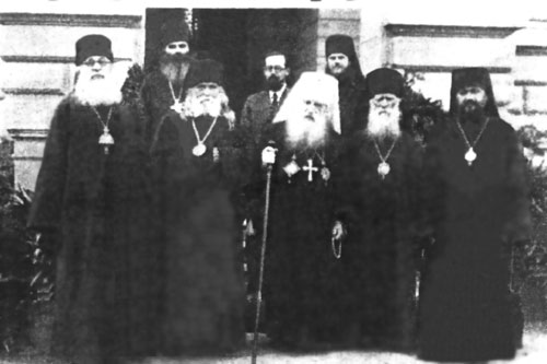 Члены Архиерейского Синода РПЦЗ (первый ряд слева направо): Феофан, архиепископ Курский, Гермоген, архиепископ Екатеринославский, Блаженнейший Антоний, митрополит Киевский, первоиерарх РПЦЗ, Сергий, архиепископ Новороссийский и Нестор, архиепископ Камчатский. Во втором ряду стоят (слева направо): келейник: митрополита Антония архимандрит Феодосий, управляющий синодальной канцелярией граф Г. Г. Грабе и секретарь архиепископа Нестора иеромонах Нафанаил (Сремски Карловцы, ноябрь 1933 г.). Трогательной была встреча с Предстоятелем РПЦЗ Блаженнейшим митрополитом Антонием (Храповицким). Еще мальчиком будущий епископ Нестор прислуживал владыке Антонию в храмах Казани в качестве жезлоносца. В последующие годы жизнь не раз сталкивала их в сложных, порой трагических, ситуациях. Со слезами умиления и радости выслушал митрополит рассказ владыки Нестора о русской жизни Дальнего Востока и подарил ему наперсный крест, украшенный драгоценными камнями. Предстоятель возвел воспитанников владыки Нестора иеромонаха Нафанаила, сопровождавшего его в поездке, и находившегося в Харбине иеромонаха Филарета[4] в сан игумена.