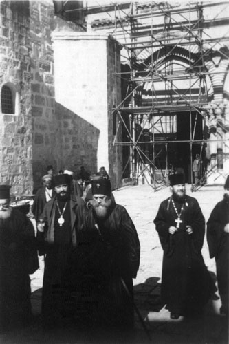 Архиепископ Анастасий, Архиепископ Нестор и игумен Нафанаил у входа в храм Гроба Господня И ныне Господь исполнял эту мечту. Серые, совершенно бесплодные, как будто выжженные горы бежали мимо окон вагона. Иногда попадались рощицы исполинских кактусов - этого растения, которое в недавние времена стало таким типичным для Палестины, иногда попадались маленькие домики местных жителей с плоскими кровлями, производившие впечатление как будто недостроенных именно благодаря плоским кровлям. Встречались караваны важных высоких верблюдов, водимых арабами, медленно двигалась группа осликов, груженных через спину товарами. Горы Палестины, вообще достаточно бесплодные и серые были особенно бесплодны теперь, ибо, как нам рассказали впоследствии, вот уже два года, что в Палестине почти не было дождя, а почва этой Обетованной страны с древнейших времен ни в чем так не нуждается, как именно во влаге. И потому дождь в Палестине всегда вызывает радость и чувство благодарности Богу со стороны всех её обитателей. В начале десятого часа утра перед нами вдалеке показались очертания города, замелькали дома современной архитектуры – здания нового еврейского Иерусалима. Поезд остановился у Иерусалимского вокзала. Любовью, лаской, родной внимательной заботой встретила нас на вокзале Русская Духовная Миссия в Иерусалимe во главе с руководителем её – великим столпом Православной Русской Церкви Заграницей – Архиепископом Анастасием. Через час мы, пройдя по серым узким Иерусалимским улицам, были уже у величайшей святыни, которую только имеет вселенная – у священнейшего Гроба Господня. Перед входом в храм Господнего Гроба расположена большая серая каменная площадка, окаймленная рядами старинных колонн здесь, когда-то была стена древнего Константиновского храма, который был гораздо обширнее и во много раз величественнее нынешнего величественного Собора. (Разрушенные части древного храма пошли на постройку огромной мечети Омара, главного святилища мусульман Палестины.) И вот, осеняя себя крестным знамением, с молитвой благодарения Богу мы переступили порог священного храма. Перед нами прямо против входа был камень помазания, на который после Распятия Благообразный Иосиф и Никодим возложили тело Спасителя, помазали миром, обвили плащаницею и отнесли во гроб; направо была Голгофа, а налево впереди вход во внутреннюю часть церкви, где находится Кувуклия, т.о есть сень над Гробом Господним, как бы отдельный храм внутри большого храма Воскресения. С глубочайшим умилением мы преклонили колена пред священным Камнем Помазания, молясь «Тебе одеющемуся светом, яко ризою», Тому, Кто в оные дни покоился здесь бездыханным Пречистым телом, чтобы воскресить всех нас с Собою. Камень Помазания осенен рядами неугасимых лампад, среди которых несколько лампад возожжено русскими руками за страдальческую русскую страну, конечно, и наша немощная слабая молитва была именно за нее же, за нашу многострадальную Родину, столько тысяч и миллионов раз устами своих бесчисленных паломников припадавшую к этому священному камню с тихой смиренной праведной молитвой. Пройдя небольшую дверь во внутреннюю часть храма, мы оказались перед священной Кувуклией, под сенью которой находится Гроб Господень. Здесь молчание сковывает человеческие уста, здесь сердце замирает в м