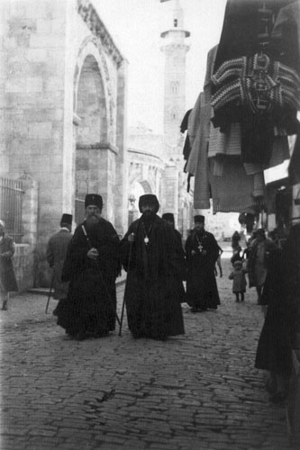 В минувшем году Митрополит Келадион по болезни покинул пост Местоблюстителя Патриаршего Престола и на его место церковный голос избрал Высокопреосвященного Митрополита Мелитона, также Архипастыря высоких духовных качеств. С Митрополитом Мелитоном Господь привел меня совершать Рождественскую службу над Яслями Господними в Вифлееме. Да даст ему Господь благодать совершить подобно всем предшественникам его святое чудо Благодатного Огня в наступающий великий предпасхальный день. В субботу 31-го декабря старого стиля по благословению Митрополита Келадиона совершал я Божественную Службу над Гробом Господним. С пятницы вечера, в сопровождении русских священнослужителей, направились мы к храму Гроба Господня. Была черная ночь, дождь лил непрерывно, вызывая глубокую радость всех жителей Палестины терпевших пред тем бездождие и засуху в течение нескольких лет. Торжественно тягуче разносились удары Святогробского колокола, пожертвованного некогда благочестивыми жителями Москвы. Священный трепет владел душой. Вот черная громада храма, вот маленькая узенькая дверь в храм. Внутри церкви также раздается звон колоколов. И русские и арабские православные богомольцы уже собрались к богослужению. Мы входим в храм: пред нами священный Камень Помазания, где некогда Пречистым Телом Своим возлежал Христос, направо возвышается Голгофа, налево вход ко Гробу. О, священнейший и благословеннейший образ, навеки врезавшийся в душу мою и освятивший ее до скончания дней моих! Было половина двенадцатого ночи, в греческом храме шла полунощница. Совершал ее греческий иеромонах, один из иеромонахов, всегда служащих при Гробе Господнем. Сотни три-четыре русских богомольцев, главным образом богомолок и сотни две православных греков и арабов было в церкви. Эти люди совершенно терялись в огромном храме, привыкшем к десяткам тысяч богомольцев. Мы снова поклонились великим святыням. Началась утреня. Начало её совершал тот же греческий иеромонах, который служил и полунощницу. Потом, взявши у меня благословение, он ушел, чтобы совершить проскомидию на Гробе Господнем. Продолжать и заканчивать утреню остался отец Нафанаил. Своды священного храма оглашались звуками молитв то на греческом, то на славянском, то на арабском языках. А вдалеке слышались молитвы армян, коптов, сирийцев, католиков на самых разнообразных языках и наречиях человеческих. И Всевышний Господь, благий Отец всех народов земли внимал этим разноязычным молитвам у этого священнейшего места, где совершилась величайшая Тайна принесения Жертвы не человеком для Бога, но Богом для человека. Храм Гроба Господня обходят архидиаконы: православный, армянский и католический, совершая каждение всего храма каждую ночь в 12 ч. ночи. Вот окончилась утреня, священники, прочитав молитвы, вступили под священную сень Гроба Господня, склоняя там колена пред Чашей, стоящей на Гробе. Потом я с архидиаконом читал входные молитвы по сложному обычаю Греческой Церкви, преклоняясь пред множеством величайших святынь, окружавших нас в эти благословенные минуты. Первоначально поклонились мы Святейшему Гробу Господню, потом меня облачили в древние торжественные кованые серебром и золотом облачения Иерусалимского Патриарха и началась Божественная Литургия у Божественнейшего места. За литургией умилительн