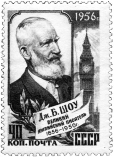 Советская марка в честь Б. Шоу. В годы первой мировой войны Шоу написал ряд блестящих антивоенных фарсов («Инка Иерусалемский», «Огэстос исполняет свой долг», «О'Флаэрти, кавалер Креста Виктории») и большую пьесу с трагическим подтекстом - «Дом, где разбиваются сердца» (1913 - 1917). Это одна из самых сложных и противоречивых пьес Шоу, знаменующая собой начало нового периода в его творчестве. В подзаголовке Шоу назвал ее «фантазией в русском стило на английские темы». Этим он подчеркнул ее сходство с пьесами своих любимых русских драматургов - Л. Толстого и Чехова. Но в ней необычайно возросло условное, гротескно-символическое отображение мира, что станет характерным и для его последующих пьес. В пьесе «Дом, где разбиваются сердца» Шоу вслед за Чеховым поставил вопрос об интеллигенции и ее роли. Именно ее мир показался ему поэтическим, но никчемным «домом разбитых сердец». Обитателям этого дома противопоставлены подлинные правители Англии, толкнувшие страну в бездну войны, - наездники из манежа и дельцы из банковских контор. Так, в сущности, Шоу определяет аристократию и буржуазию. Причудливый дом, построенный в форме корабля и оглашаемый свистками и криками хозяина, старого капитана Шотовера, мудреца и безумца, споры о любви и смысле жизни, который ведут обитатели дома, и внезапно завершающий их налет германской авиации, неожиданное включение темы войны - все это так непохоже на ранние пьесы Шоу, написанные в классических традициях критического реализма. Октябрьскую революцию в России Шоу воспринял и приветствовал как спасение человечества. Он боялся, что она будет подавлена полицией и войсками, но каждый день приносил все новые и новые вести о полном ее торжестве. Фабианская теория, по которой вооруженное народное восстание обречено на провал, потерпела крах на глазах старого фабианца, и это приводило его в восторг. Видимо, прав был Палм Датт, написавший позднее о Шоу: «Если он и отвергал концепцию социалистической революции, как иллюзию, пока 1917 год не открыл ему глаза, он отвергал ее не с самодовольством ренегата, а с отчаяньем лишенного наследства... Теперь Шоу приветствовал большевистскую революцию» 12. С первых лет существования Советского государства Шоу стал его другом и остался им до конца своей жизни. Он присоединился к движению «Руки прочь от России!», он горячо защищал Октябрьскую революцию в печати. Здесь особенно следует отметить его статью «Диктатура пролетариата» (1921). С искренней любовью и восхищением он говорил о В. И. Ленине. В 1921 году он послал Владимиру Ильичу свою книгу - пенталогию «Назад, к Мафусаилу», которой сам он придавал очень большое значение. Шоу называл В. И. Ленина величайшим государственным деятелем Европы. В июле 1931 года Шоу посетил Советский Союз и отпраздновал здесь свое семидесятипятилетие. 26 июля этот знаменательный день был торжественно отмечен в Москве, в Колонном зале Дома Союзов. На вечере присутствовали писатели, журналисты, актеры, представители общественных организаций, главы иностранных миссий. С приветственной речью и докладом о творчестве Шоу выступил А. В. Луначарский. Ответная речь Шоу блистала остроумием и в то же время была серьезной и пылкой. В дни пребывания в Советском Союзе Шоу поражал своих собеседников энергией и неутомимостью. Осматривая города и их окрестности, колхозы и 