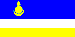 Флаг Республики Бурятия (Положение о Государственном флаге) был утверждён Постановлением ВС РБ от 29 октября 1992 года № 268-XII, тогда же отдельным законом внесли изменения в Конституцию. Флаг состоит из трёх горизонтальных полос: синей, которая вдвое шире остальных, белой и жёлтой. В древковой части синей полосы на расстоянии 1/4 длины флага от древка изображено золотое соёмбо (т.е. изображение луны, солнца и очага из трёх языков пламени). Отношение длины флага к его ширине равно 2:1. Авторы флага Н.Батуев, В.Абаев, С.Калмыков. Полосы флага иногда объясняются как господствующие в разное время в Бурятии религии: синяя - добуддийское тенгрианство, белая - православие, жёлтая - ламаизм. |