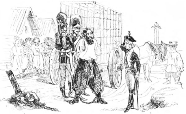Пугечев и Суворов«В Уральске комендант Симонов сдал Суворову Пугачева. Приказав готовиться в обратный путь, он хотел сам проводить злодея. Сделана была железная клетка; ее поставили на двухколесную телегу, и в нее посадили Пугачева, окованного кандалами по рукам и ногам. Три роты солдат, 200 казаков и 2 пушки взял с собой Суворов и неусыпно надзирал сам во время пути. В деревне Мостах на Иргизе, ночью сделался пожар. Опасаясь злоумышлений, Суворов не спал до утра и сидел подле клетки Пугачева. В Самаре, после 400-верстного перехода по степям, переправились через Волгу, несмотря на буйную погоду, и в Симбирске Суворов представил своего пленника Панину». Цитируется по изд.: Полевой Н.А. История князя Италийского, графа Суворова-Рымникского, генералиссимуса российских войск. М., 1904, с. 61-62.