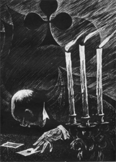 Иллюстрация к циклу «Клуб самоубийц». «Клуб самоубийц» — ироническое наименование эстетских кружков и групп, предшествовавших декадентским содружествам и группировкам «конца века». Предметом стивенсоновской пародии служит мнимая значительность, эгоцентризм и крикливая поза поклонников меланхолии, проповедников упадочнических идей и настроений. «Клуб самоубийц» — заведение для избранных, его посещают чувствительные юноши и молодые люди «со всеми признаками острого ума», однако без намека на энергию и волю, которые способны обеспечить жизненный успех. Клубная атмосфера насыщена экзальтацией. Вспышки лихорадочного веселья сменяются жуткой немотой. Занятия немногочисленны, праздны, но по-своему деловиты, и все делается с позой пресыщенности и под знаком упадочнической бравады. Вино, беседы о смерти и способах самоуничтожения, карточная игра, в которой фатальная карта намечает очередную жертву и очередного убийцу,— таков ритуал этого «храма опьянения». Дух смерти витает над собравшимися, тема смерти на смоченных вином устах. «Что касается меня,— говорит один из добровольных самоубийц,— единственное, о чем я мечтал, это о повязке на глаза да вате, чтобы заткнуть уши. Но увы! В этом мире не сыскать достаточно толстого слоя ваты!» Другой уверяет, что он ни за что не стал бы членом клуба, если бы теория мистера Дарвина не представлялась ему столь убедительной. «Мысль, что я являюсь прямым потомком обезьяны,— сказал сей оригинальный самоубийца,— показалась мне невыносимой». «Неужели все это так важно, чтобы поднимать такую суету, — комментирует про себя предмогильную беседу принц Флоризель. — Если человек решился уйти из жизни, какого черта он не совершает этот шаг, как подобает джентльмену». Иронический характер диалога и комментария очевиден, и в словах комментатора слышен голос самого автора. Замысел авантюрных историй с «Алмазом Раджи» более разветвлен и обширен. Бытовая и психологическая его основа и социальная направленность выступают вполне отчетливо, едва прикрытые призрачным покровом фантастического сюжета. В четырех новеллах рассказывается о том, как некий Томас Ванделер, находившийся в Индии в рядах английских колониальных войск, оказывается владельцем необыкновенного алмаза кашгарского раджи. Загадка этого таинственного при- [18] обретения, щедрого подарка за «услуги», служит предметом недвусмысленных толков. Новоявленный собственник поразительной драгоценности из бедняка превращается в немыслимого богача, и автоматически безвестный и грубый служака становится прославленным светским львом. Почтительно и радушно его принимают в избранных кругах Лондона, и в скором времени объявляется знатная девица, пожелавшая обладать алмазом «даже ценою брака с сэром Томасом Ванделером». Алмаз Раджи, подобно лоскутку шагреня из романа Бальзака «Шагреневая кожа», наделен магической и зловещей силой. Разжигая вожделения, он переходит из рук в руки, вовлекая в авантюрный круговорот новых участников и новые жертвы. Это завораживающий символ собственности, и под его воздействием ничтожества возвеличиваются, нравственные понятия искажаются, истинные ценности подменяются ложными. И так тянется цепь злополучных событий, пока принц Флоризель своим вмешательством не кладет им предел. Нарушая права собственности, 