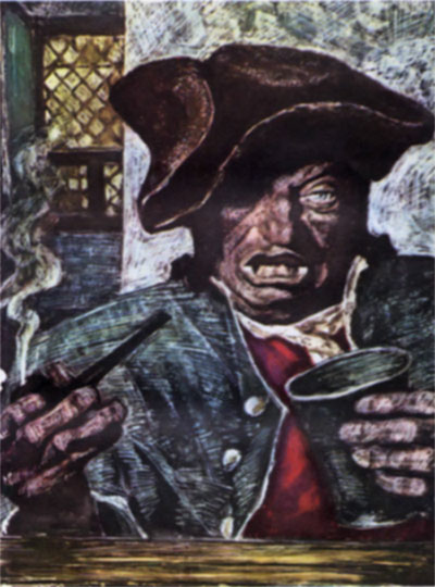 Иллюстрация к роману «Остров Сокровищ». Стивенсон не очень заботится о том, чтобы держать читателя в таинственном неведении, и не склонен чистой иллюзией подогревать его любопытство. Он не боится предуведомляющих намеков относительно исхода событий. Такой намек содержится в словах Джима Хокинса, героя книги, о том, что он записал всю историю по просьбе своих старших друзей; таким образом сообщено, что основные участники приключений, за судьбу которых приходится тревожиться читателю, вышли из испытаний с торжеством. И вывеска трактира «Адмирал Бенбоу», проткнутая саблей разгневанного Билли Бонса, след от которой, как подчеркивает, забегая вперед, Джим, и до сих пор виден, и подстрочные примечания, сделанные доктором Ливси, где говорится о том, что о некоторых событиях на острове узнали позднее, и другие детали — все это последовательно нару- [26] шает таинственность будущего, столь будто бы для приключенческого жанра важную и даже обязательную. Однако, предуведомляя читателя о ходе событий, автор усиливает доверительный тон повествования, рассчитывая на эффект достоверности. По-видимому, Стивенсон учитывал опыт Джорджа Мередита, который, развертывая сюжет, не боялся забегать вперед. Небезынтересно, что в статье, посвященной романам Дюма, обозначая задушевный круг своего чтения, Стивенсон рядом с образцовым авантюрно-приключенческим романом «Виконт де Вражелон» ставит психологически изощренный роман Мередита «Эгоист», явившийся для своего времени новым типом психологического романа. Переходы от эпизода к эпизоду в «Острове Сокровищ» и в других приключенческих произведениях Стивенсона не всегда кажутся точно выверенными, но коль скоро сюжетный поворот сделан, ситуация определена, персонажи заняли исходные позиции, то все начинает двигаться без нажима и скрипа, возникает живая картина событий, и создается впечатление точности и психологической достоверности происходящего. В самом деле, раскройте книгу, и вы увидите старого «Адмирала Венбоу» и морского волка, который стучится у двери, и услышите его хриплый голос. Важно учесть в этой связи признание самого Стивенсона. В ответ на письмо Генри Джеймса с разбором романа «Катриона» Стивенсон, между прочим, подчеркнул: «Справедливо ваше за-мечание относительно того, что в этой книге ослаблено зрительное впечатление. Это несомненно, и, коль скоро я приложу к этому дополнительные усилия, а я так убежден в их необходимости, боюсь, что в будущем это станет еще более несомненным. Две мои основные цели можно определить так: 1. Война прилагательному. 2. Смерть зрительному нерву. Если считать, что мы переживаем в литературе эпоху зрительного нерва. Сколько веков литература успешно обходилась без него». Автохарактеристика, как это нередко случается, может противоречить творческой реальности, создаваемой художником. Так и со Стивенсоном в его бунте против «прилагательного» и неприязни к «зрительному нерву» не так просто согласиться, припомнив картины, им же самим набросанные. Однако стоит присмотреться к этим картинам, чтобы лучше понять позицию Стивенсона, и надо иметь в виду, что он не пренебрег замечаниями Генри Джеймса. Пояснив свои задачи в литературной технологии, он умерил воинственный тон словами: «Все же я учту Ваше письмо». Вот Джим Хокинс, спрятавшись в бочке из-под яблок