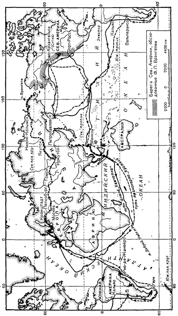 Кругосветные плавания Ф.П. Врангеля. [53] Как это иногда бывает, старик, ехавший в бричке, вдруг увидел себя со стороны, но не таким, каким он был теперь, седеньким, сгорбленным, а увидел адмирала Врангеля, которому еще не стукнуло и пятидесяти. «Экие дела делает время, — подумал он, — ведь тогда, в пятьдесят, полагал: ой, как много, ой-ой, сколь прожито. А ныне встретишь пятидесятилетнего и завидуешь — молодой человек, право, молодой. А уж которому и полусотни нет, так его за вьюношу почитаешь...» После Русской Америки в петербургскую пору жизни было у него немало огорчений: и в правлении Российско-Американской компании, и в морском министерстве, и в Государственном совете — с чиновниками, обросшими бюрократизмом, как монахи жиром, со всяческими обломовыми, покойно сидящими на весьма высоких постах Российской империи. Но было и немало светлого. Да вот хоть вечера в дружеском кругу. Бывало, собирались у статского советника Владимира Ивановича Даля, в доме его, что у Александрийского театра. Хозяин — умница, литератор и этнограф, большой приятель покойного Пушкина. В комнатах пахло книгами. Приходили туда и Литке, и Анжу, и профессор Арсеньев Константин Иванович, заглядывали и «патриархи» — Иван Федорович Крузенштерн, Петр Иванович Рикорд — сподвижник Василия Михайловича Головнина. Всем хорошо было в далевской квартире. Вот там, в доме у Александрийского театра, и говорили часто об ученом обществе географов. Там весной сорок пятого... Да, именно там и состоялось собрание членов — учредителей Русского географического общества, и Федор Петрович Литке огласил прожект Общества. А потом, когда «младенец» родился, какая бойкая и увлекательная жизнь закипела в доме Общества на Мойке, у Певческого моста. А в первое годовое собрание — сумеречный день был, снежный, в конце ноября — он, адмирал Врангель, читал свой доклад «О средствах достижения полюса» *. Краткий доклад. У них, в Обще ____ * Этот замечательный доклад был плодом долголетних размышлений Врангеля над опытами своей экспедиции по Ледовитому океану. Врангель предлагал достичь полюс с северного берега Гренландии на 10 нартах с собаками. Впоследствии Роберт Пири поступил именно так. [54] стве, отменное правило установили: более часа речь не держать! Для всех равно; а стало быть, и для него, Врангеля, руководителя отделения общей географии *. Да-с, были в Петербурге хорошие времена. А все же лучшие годы — он это и тогда знал — лучшие годы были позади, канули в прошлое. Почему-то природа устраивает все с такой коварной жестокостью: оставляет желания, но отбирает силы... Шестидесяти восьми лет он навсегда уехал из Петербурга. Неприметно покатились годы в эстонском имении Руиль, что в двадцати пяти верстах от города Раквере. И вдруг им овладело неудержимое стремление, ведомое многим старцам: ему нужно, ему непременно нужно еще раз взглянуть на места, где прошли детство и отрочество, где впервые прозвучала придуманная рыжим мальчуганом песня с припевом «Туда, туда, в даль, с луком и стрелою...» Надо спешить. Ему уже, слава богу, семьдесят четвертый. Он едва дождался вешних дней. И вот— бричка, пара вороных, Михель Якобсон на козлах. — Михель, скоро приедем? — Скоро... барин... Эге, вон уже виден Дерпт, руины на холме, островерхие крыши и ратуша на площади, где всегда так громко кричат галки. У брата в Дерпте Ферд
